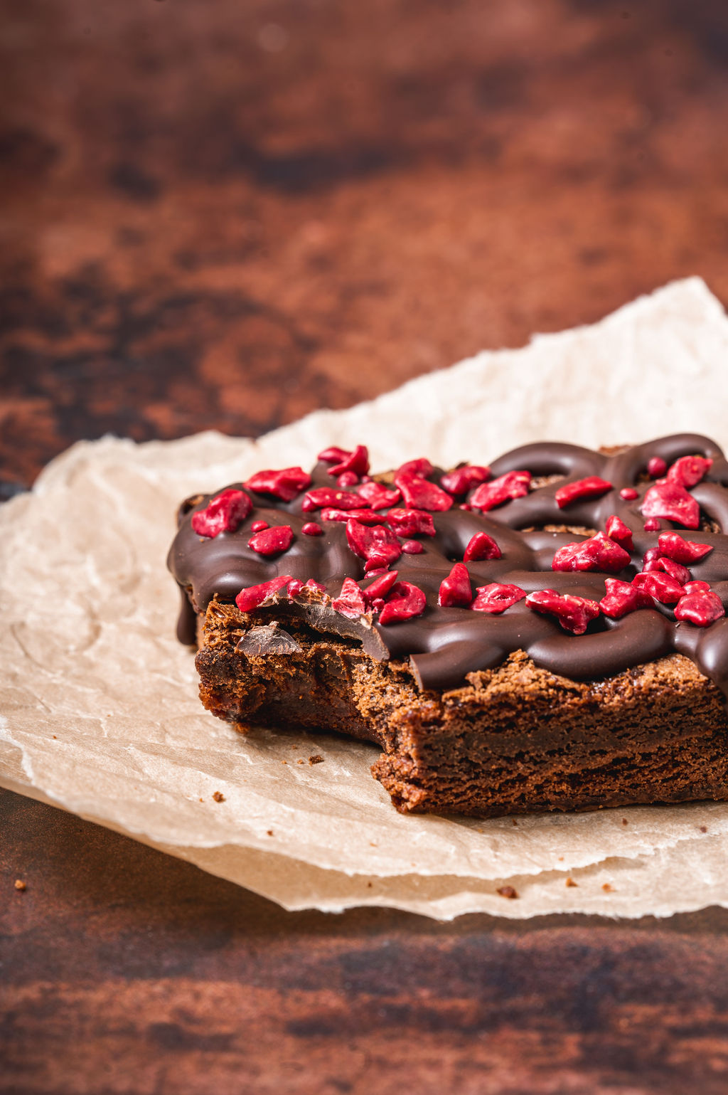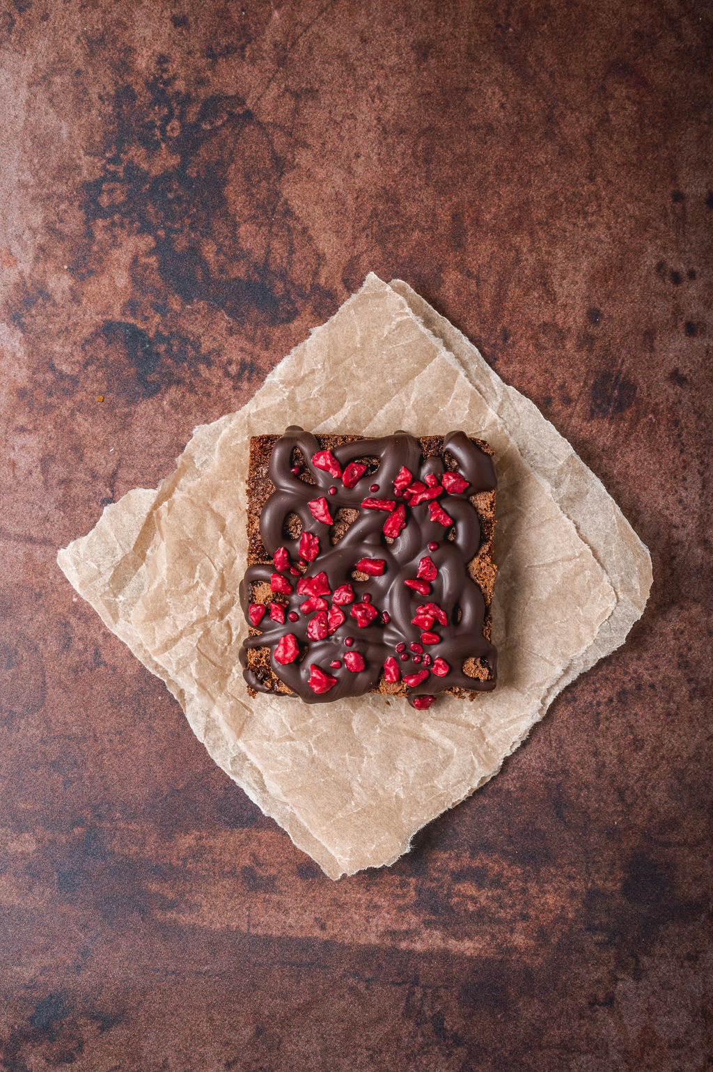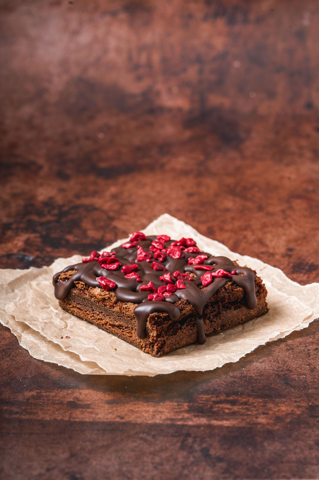 Een glutenvrije brownie zoals een brownie hoort te zijn. Met een knapperige buitenkant, een smeuïge binnenkant en een heerlijke, rijke chocoladesmaak. Deze brownie hebben wij gevuld met heerlijk frisse frambozenstukjes en na het bakken gegarneerd met Belgische pure chocolade en gevriesdroogde frambozen.