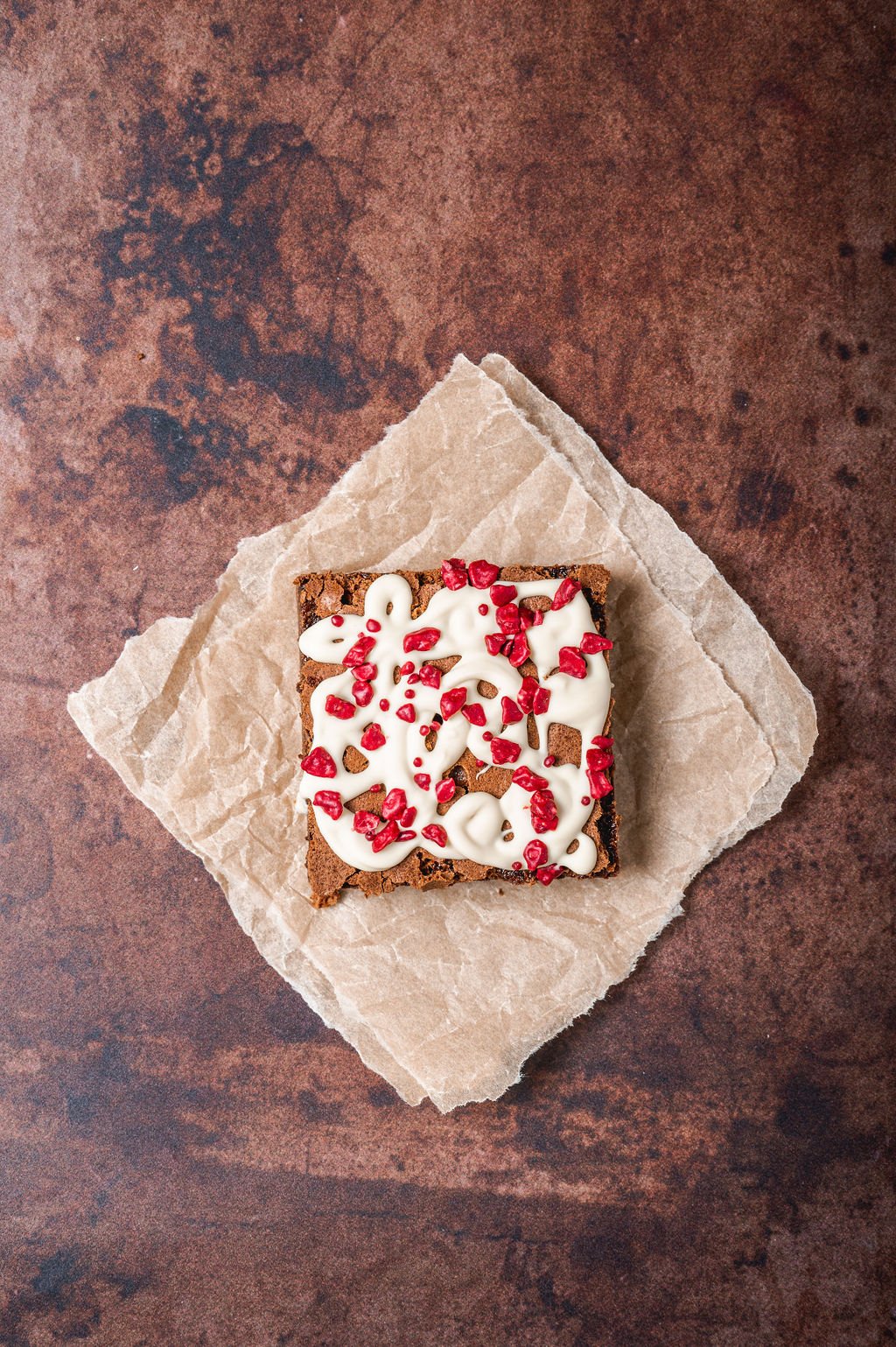 Heerlijk smeuïge glutenvrije brownie gevuld met framboos en afgetopt met Belgische witte chocolade en gevriesdroogde frambozen. Een heerlijke zomerse browniesmaak tijdelijk in ons assortiment.
