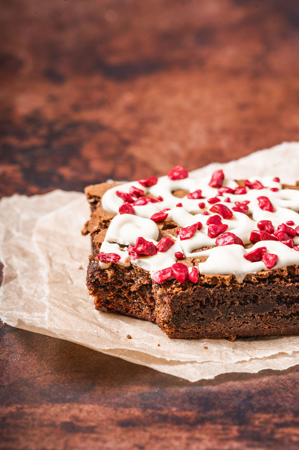 Onze heerlijke smeuïge glutenvrije brownie gevuld met stukjes framboos. Deze brownie is gegarneerd met Belgische witte chocolade en gevriesdroogde frambozen dit maakt heb een heerlijk frisse zomerse traktatie