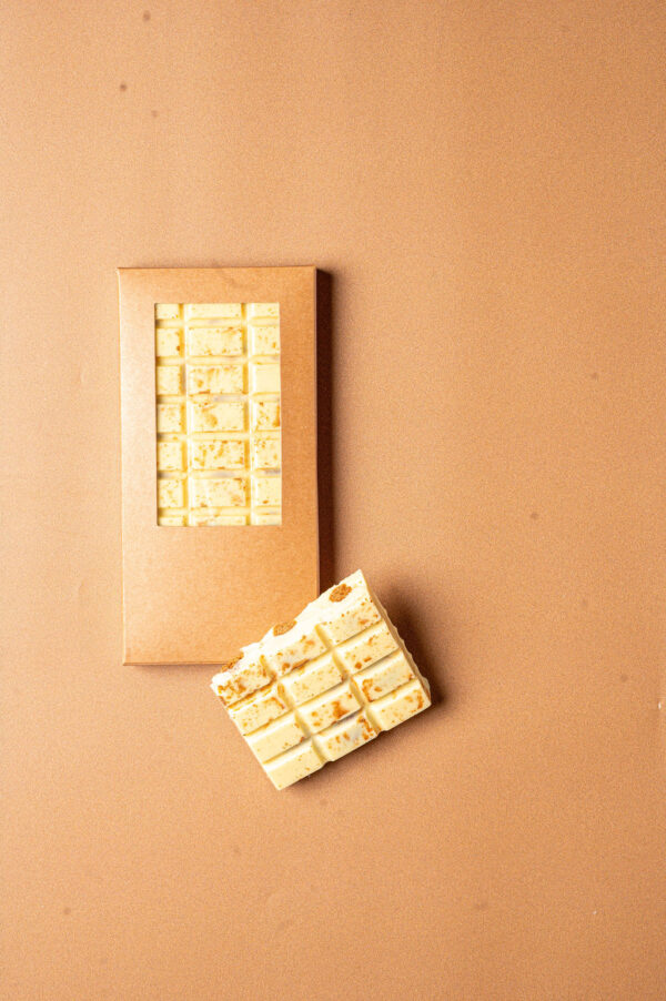 Een heerlijke glutenvrije witte chocoladereep gevuld met ambachtelijke kruidnootjes die wij zelf bakken met de lekkerste kruidnotenkruiden.